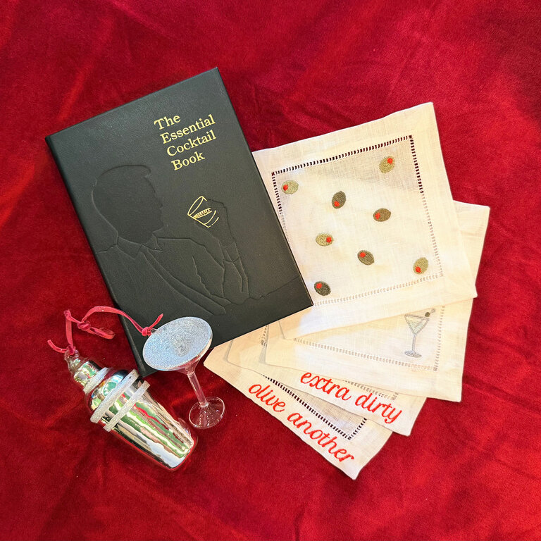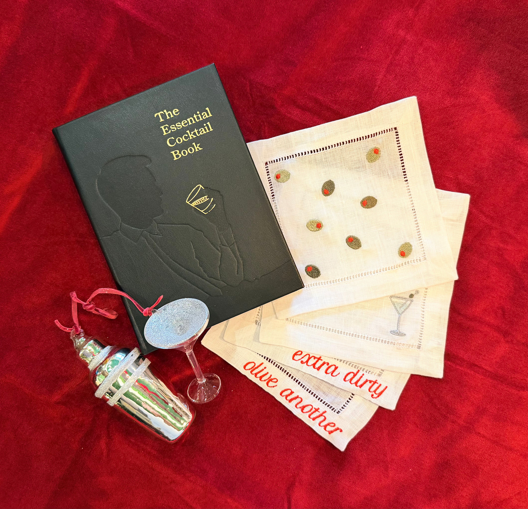Includes The Essential Cocktail Book with 150 recipes and photos; a set of four different embroidered cocktail napkins (multiple olives, martini, "extra dry", "olive another one"; shaker/martini ornament. Great for a cocktail party hostess gift.