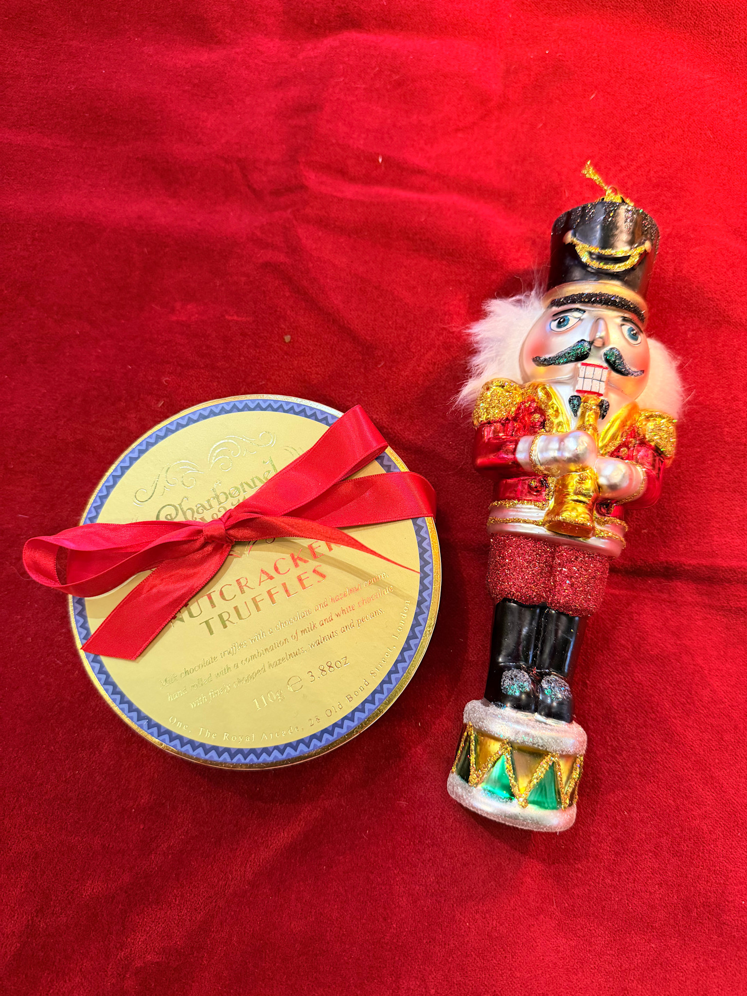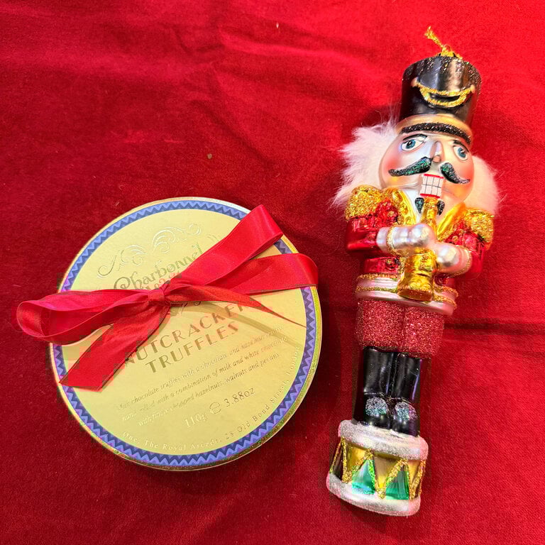 Charbonnel milk chocolate truffles with chocolate hazelnut center. Hand rolled in milk and white chocolate with finely chopped hazelnuts, walnuts, and pecans. This item is paired with a glass nutcracker orn. Great for gift giving.